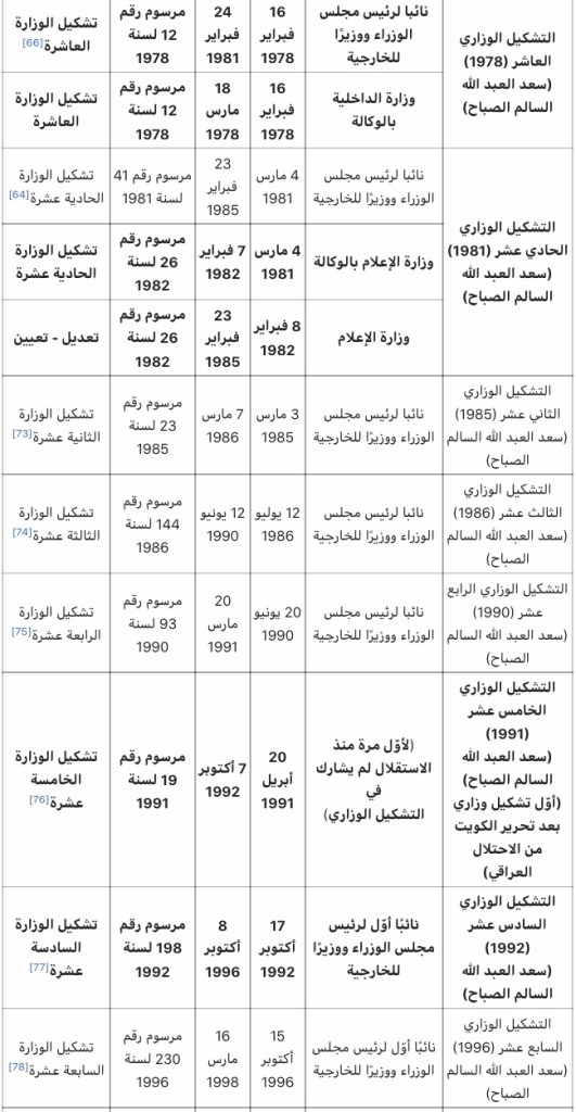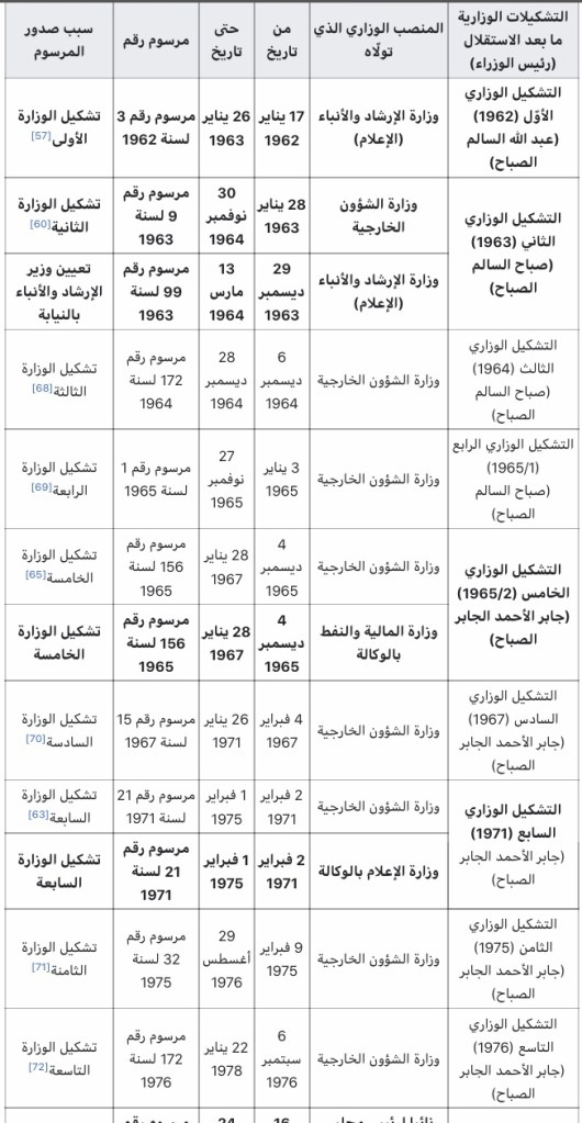 يعد صباح الأحمد المهندس الإستراتيجي للدبلوماسية الكويتية العربية والباني الحقيقي لها.[61] فوزارة الخارجية الكويتية على الصعيد العربي والعالمي في عهد وزيرها الأوّل صباح السالم في التشكيل الوزاري الأوّل، لم تكن بعد قد اكتمل تأسيسها ولم تكن البعثات الخارجية للدولة قد انتشرت دوليا كما حصل بعد ذلك. وقد جاء صباح للوزارة مركّزًا على الانفتاح والتضامن والدمج والتناغم مع المصالح العربية.[61] ليستمر إثرها وزيرًا للخارجية طيلة أربعة عقود من الزمن.[62] وبالإضافة إلى وزارة الخارجية التي شغلها منذ التشكيل الوزاري الثاني في الكويت ما بعد الاستقلال، شغل صباح وزارات أخرى بعضا منها بالوكالة، أبرزها كانت وزارة الإعلام التي شغلها أربع مرات، مرتان منها بالوكالة، حيث سبق الإشارة إلى أنّه كان أوّل وزير للإعلام (للإرشاد والأنباء في مسماها القديم) لمّا عيّن في التشكيل الوزاري الأوّل. وفي التشكيل الوزاري الثاني، عاد وزيرًا للإرشاد والأنباء بالوكالة في 29 ديسمبر1963 وحتى 13 مارس1964بعد أن استقال مبارك العبد الله الأحمد الصباح من الوزارة.[60] وفي المرة الثالثة تولى وزارة الإعلام بالوكالة بمسمّاها الجديد ما بين 2 فبراير1971 وحتى 3 فبراير1975، وذلك في التشكيل الوزاري السابع لحكومة دولة الكويت[63]، حيث أصبحت “وزارة الإرشاد والأنباء” تسمى “وزارة الإعلام”، وذلك تماشيا مع قرار مجلس وزراء الإعلام العرب في دور انعقاده العادي السادس في القاهرة في شهر يناير عام 1970 الذي دعا حكومات الدول الأعضاء إلى النظر بتوحيد تسمية الوزارات المختصة بشؤون الإعلام تحت مسمى “وزارة الإعلام”.[13] والمرة الأخيرة كانت في التشكيل الوزاري الحادي عشر، في 4 مارس1981 حيث عيّن وزيرا للإعلام بالوكالة، ثم عدّل التشكيل الوزاري فألحقت الوزارة به بصفته وزيرا للإعلام في 8 فبراير1982 واستمر على رأس وزارة الإعلام حتى 3 مارس1985.[64] كذلك شغل وزارة المالية والنفط وزيرا بالوكالة (كانت وزارة واحدة) في التشكيل الوزاري الخامس بعد الاستقلال، وذلك في الفترة الممتدة ما بين 4 ديسمبر1965 إلى 28 يناير1967 ليترأس إثر ذلك مجلس إدارة الصندوق الكويتي للتنمية الاقتصادية العربية طيلة تلك الفترة.[65] وفي التشكيل الوزاري العاشر بعد الاستقلال، عُيّن وزيرًا للداخلية بالوكالة في الفترة الممتدة ما بين 16 فبراير1978 وحتى 18 مارس1978.[66] وبحكم منصبه كوزير أصبح عضوًا في مجلس الأمة، وكان خلال هذه الفترة يترأس نادي المعلمين الكويتي.[67] فيما يلي جدول بالمناصب الوزارية التي تولّاها بعد الاستقلال: